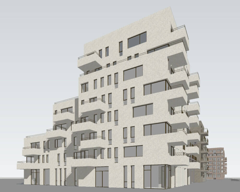 Blok 2A-3 is een knipoog naar blok 4, de eyecatcher van de nieuwe wijk. Blok 2A-3 ontwerpen we in dezelfde baksteen. Per verdiepingen maken we onderscheid door metselwerk-banden in tegelverband. De gevelopeningen en balkons zijn strak naast en onder elkaar gepositioneerd.
